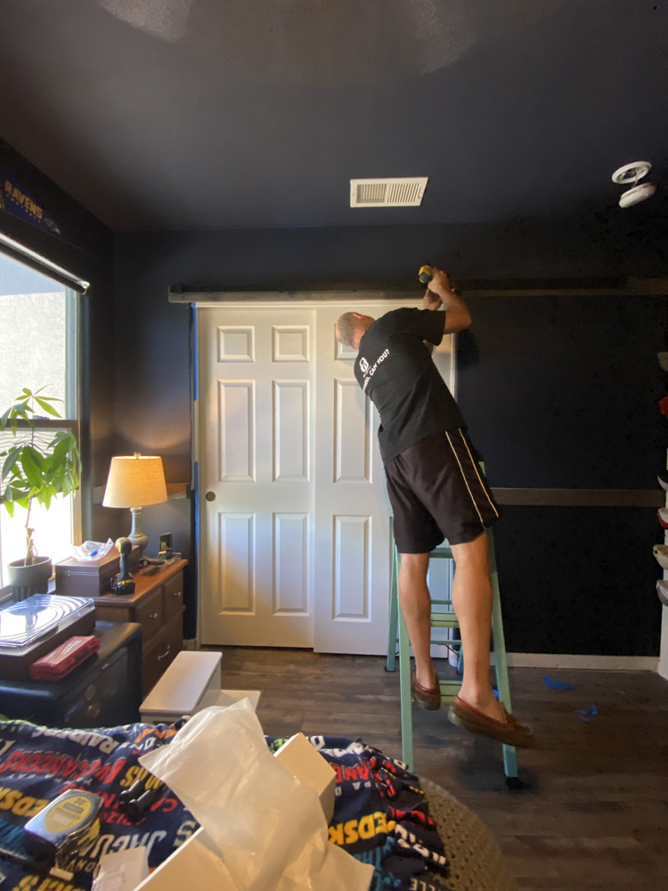 May 2025We recently updated Ryder's room that had had builder-grade closet with sliding doors. I really wanted barn doors, but there wasn't much room on one side of the closet, and I wanted the doors side-by-side and not pass-through mount. I planned it so the barn door track was long enough for both doors to slide to the right so the entire closet is accessible, so one door can slide right or both — and they are small doors and very easy to slide together with the new handles we added. We watched lots of how-tos on how to convert the existing doors. We ended up using 1/4 plywood attached with a nail gun to the front of the door, and also cut strips of the plywood to make a simple more modern barn door pattern. I first stained the entire door, but it looked to plain so I ended up using matte black paint on the panels. Ryder is thrilled with it and we think it is a huge improvement! Click any image for larger view. |