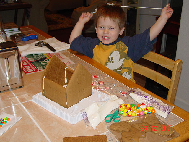 Hunter ready to work on the gingerbread house. Gingerbread house kit Hunter being silly Hunter Hunter Hunter decorates a tree Finished Finished