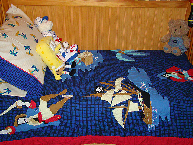 September 20, 2008Hunter has had a sports theme since he was a baby, so we decided it's time for a change. We will be moving the furniture into the new baby room and getting new furniture for Hunter soon, but it is coming along nicely with his new pirate theme! We have matching pillows and more accessories on the way. Click any image for larger view.